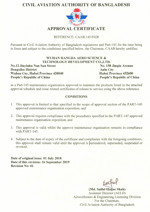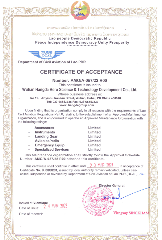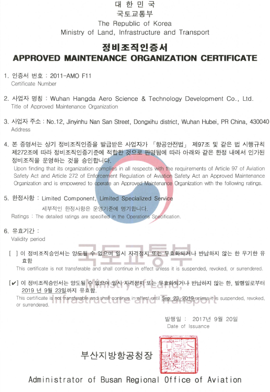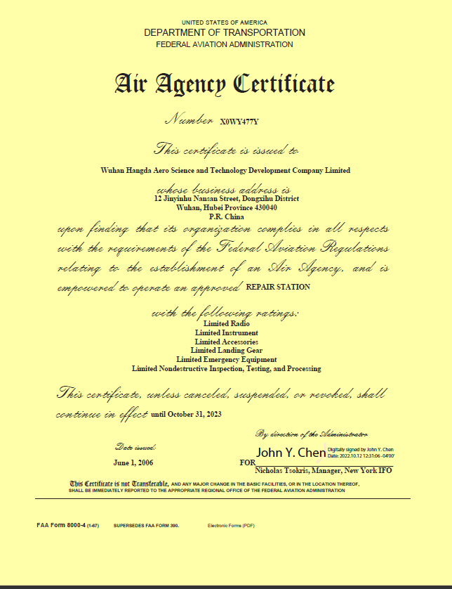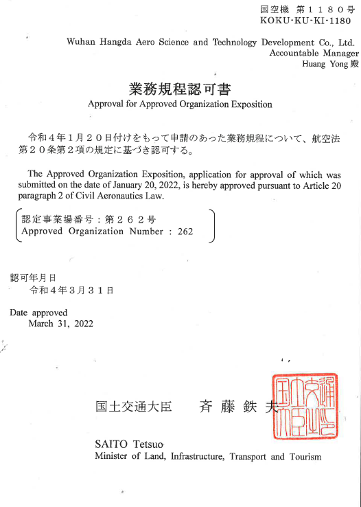 2021年11月11日,武漢航達(dá)正式獲得改裝設(shè)計(jì)委任單位代表(DMDOR)授權(quán),成為中南地區(qū)首家獲批的航空部附件維...